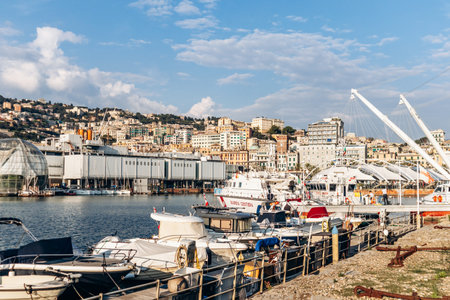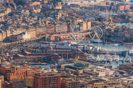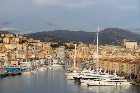 GENOA, ITALY - MARCH 20, 2021: Panoramic view of port of Genoa with Porto Antico, boats and the colorful houses on italian coastline.