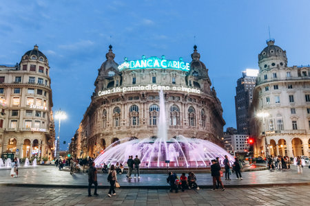 Genoa, Italy - September 22, 2024: View of Piazza De Ferrari, the main square of Genoa, featuring the iconic bronze fountain designed by Giuseppe Crosa di Vergagni in 1936