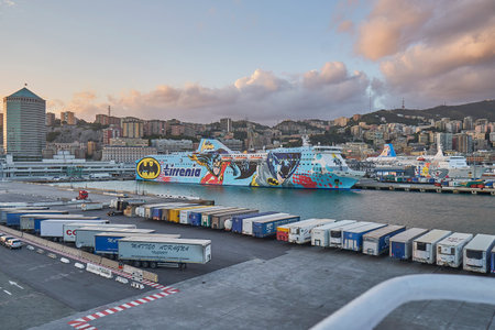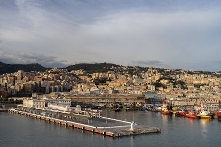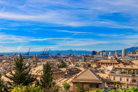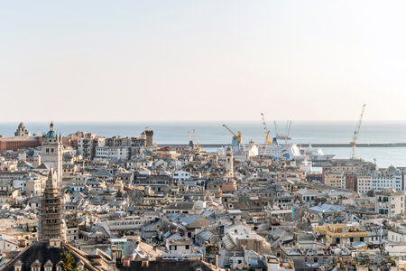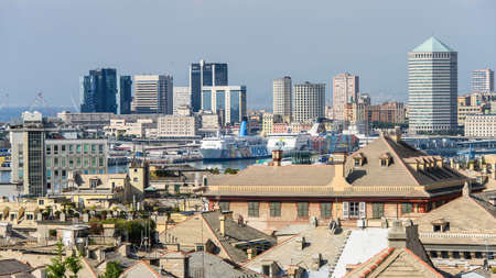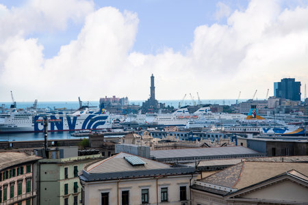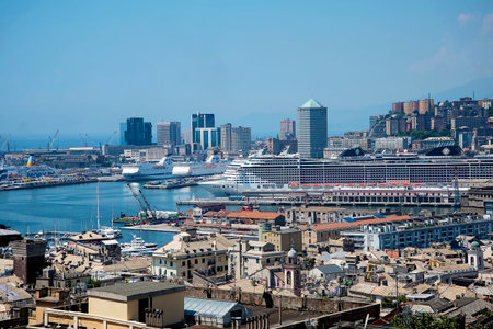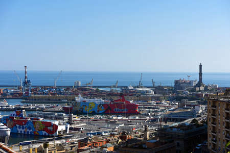 Genoa, Italy - September 24, 2018: View from the top to the seaport of Genoa, big ships and houses. Amazing landscape, blue sky and sea. Summer time