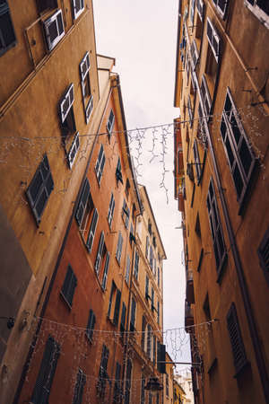 Genova, Genoa, Italy - April 18, 2019: Charming streets of Genoa, Italy. Old famous city of Italy, with beautiful architecture, houses, roofs, buildings on sunny day.