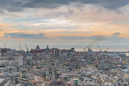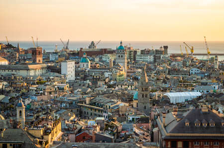 Genoa old city at sunset from Spianata Castelletto in Italy.