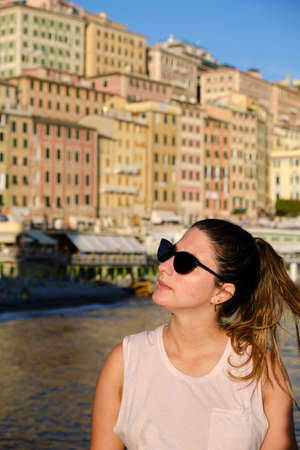a young model wearing sunglasses in the coast a the beach of camogli, Liguria, Italy. with the colorful houses at the background