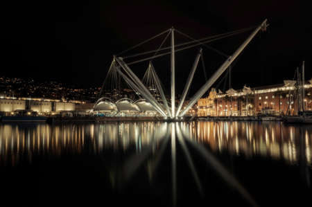 Porto Antico di Genova seen at night, with a view of the bigo, the Biosphera, the lighthouse