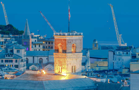 Aerial view of the Genoa in night lighting at sunset.
