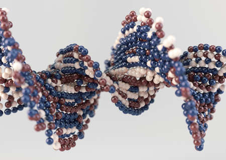 A model of a sequenced pattern of DNA style red blue and cream atom balls on an isolated background - 3D render