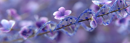 A delicate, artistic rendering of a DNA double helix with blooming purple flowers interspersed
