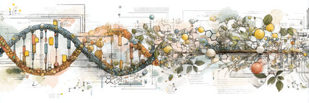 Artwork illustrates a DNA double helix blending with natural elements and scientific symbols, emphasizing the connection between life and science.