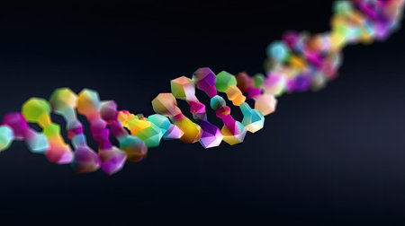 This captivating image features a colorful abstract representation of a DNA molecule. It showcases vibrant geometric shapes set against a dark background, emphasizing the intersection of science and art.