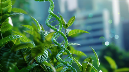 A vibrant 3D visual of a DNA double helix nestled among green leaves, symbolizing the harmony between nature and advanced science in a modern city.
