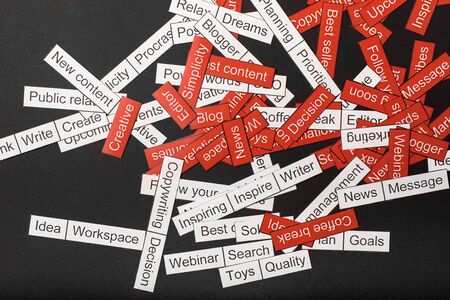 Word cloud of business themes cut out of red and white paper on a gray background.