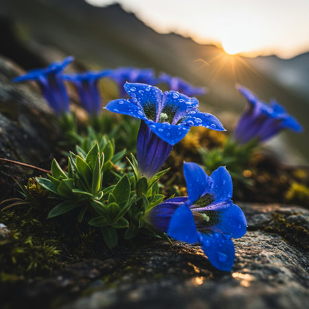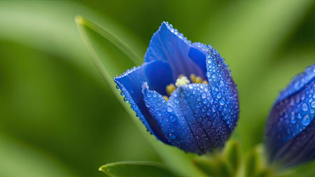 Blue petals covered in morning dew, vivid water droplets, fresh plant life