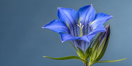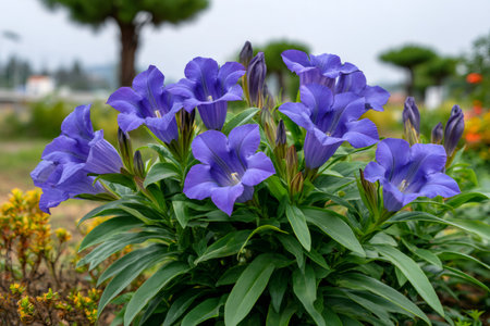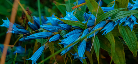 Gentian flowers with vibrant blue petals and green leaves blooming outdoors