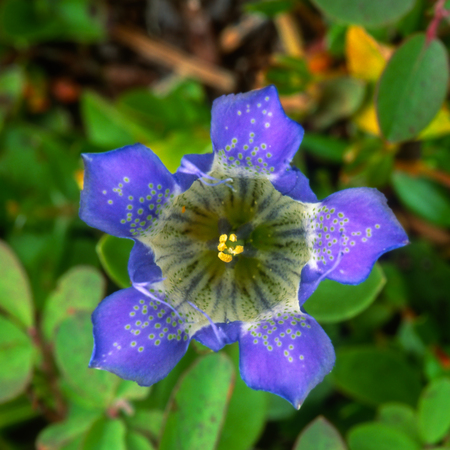 Close up of square format macro portrait of a Bog Gentian or Explorer's Gentian alpine wildflower. Gorgeous vivid dark blue and purple colors with bright yellow stamen. Subject is sharp and nicely isolated from the background.