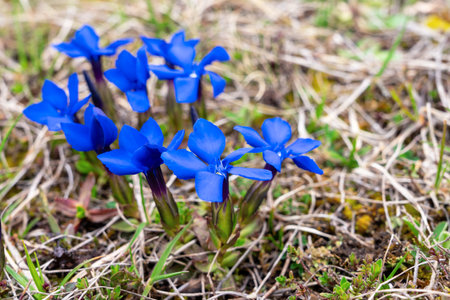 blue gentian (gentiana clusii), one of the first blossoms in spring, heather in south Germany.