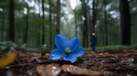 Blue flower in the forest with blurred people in the background. Shallow depth of field
