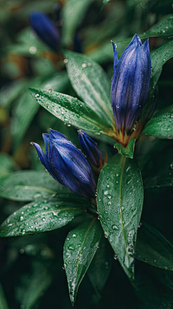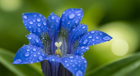 Gentian in gentle light rain, soft raindrops visible on vivid green leaves, natural realistic style, bright fresh colors, balanced wide composition, cinematic framing, highly detailed.