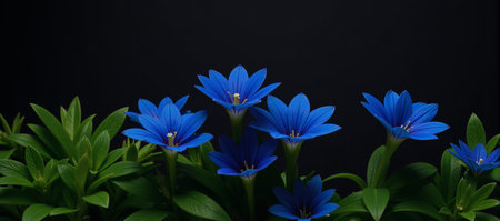 Moody Botanical Composition Dark blue-hued blooms surrounded by vibrant green foliage on a somber backdrop