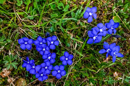 Close-up of bright blue gentian flowers blooming amidst natural meadow grass and foliage, showcasing vivid colors and lush surroundings.