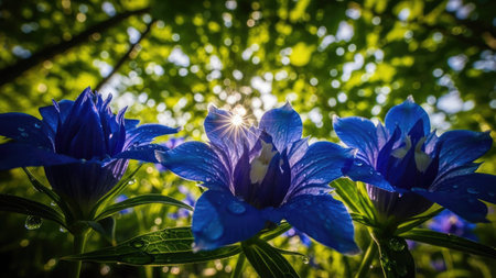 This photograph features three striking blue flowers in focus, set against a backdrop of blurred green foliage. The composition uses natural sunlight, creating a bright and airy atmosphere. The image is likely suitable for use in various commercial applications, including decorative prints and illustrative content.