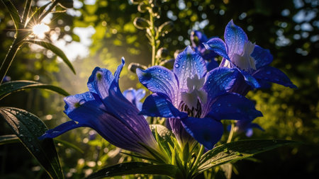 This image showcases a cluster of vivid blue flowers in full bloom. The petals display a range of shades, from deep indigo to lighter hues. The composition is framed by lush green foliage and soft sunlight filtering through the leaves, creating a warm, inviting atmosphere. This photo is suitable for various commercial uses.