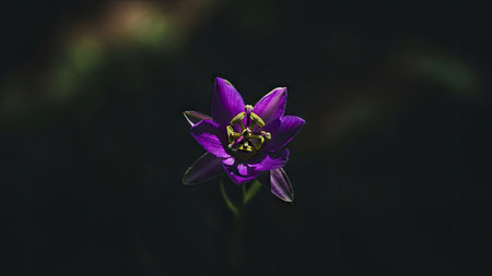 A close-up shot features a single purple flower, highlighted against a dark background. The composition emphasizes the flower's intricate details with focused lighting, showing contrasting textures and colors. This image is suitable for diverse commercial applications, encompassing editorial content and design projects.