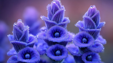 A macro photograph presents vivid blue flowers, their petals adorned with glistening water droplets. The composition emphasizes the intricate details and textures, set against a blurred background. The style suggests a focus on natural beauty, suitable for various editorial and commercial applications. The lighting suggests it might be taken during the day.