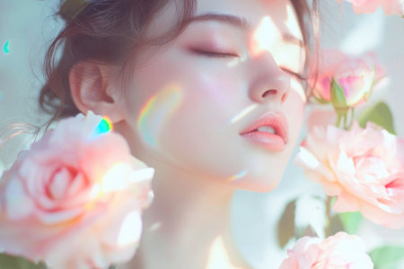 A beautiful Asian woman with roses in her hair soft and delicate skin with bright sunshine.