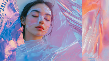 A woman with closed eyes and a facial mask, with soft pink and blue tones. The woman is wearing a light-colored top.