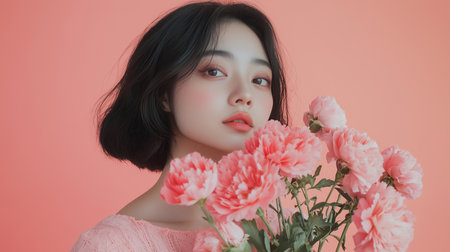 Portrait of a woman with delicate pink flowers, against a soft peach background, evoking beauty and natural elegance.