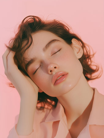 A tranquil young woman with flowing hair stands against a soothing blue backdrop, exuding calm and introspection. Her closed eyes and gentle expression invite viewers to share in a moment of peace and self-reflection, embodying a serene atmosphere