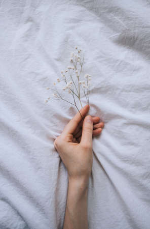 Female hand holds a dried white flower on a white fabric background.