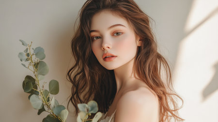 portrait of a confident woman with glowing skin and a serene expression.