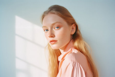 An AI illustration of A beautiful young Caucasian woman stands with confidence in front of a bright blue wall