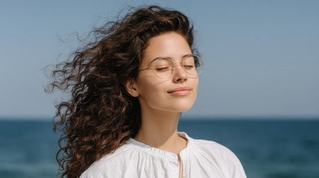 A young woman with curly hair stands by the seaside, eyes closed, embracing tranquility and joy in the gentle breeze under a clear blue sky.