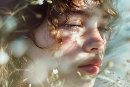 Closeup of a peaceful young womans face surrounded by delicate white flowers