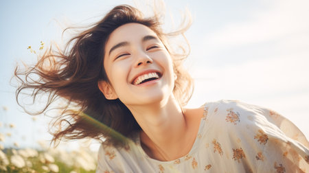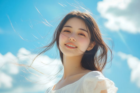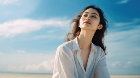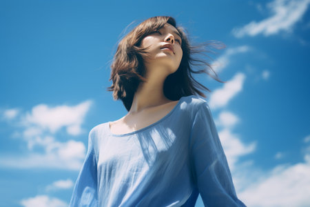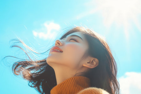 Young Asian woman looking up with confidence, hair blowing in wind against a clear blue sky, embracing natural beauty