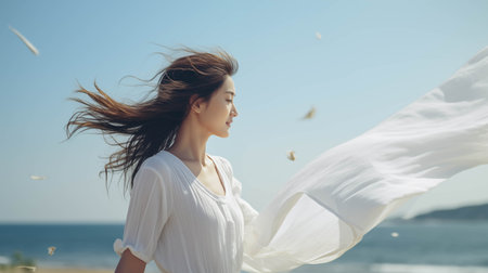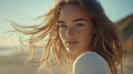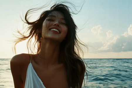 A carefree woman with windswept hair enjoying the breeze on a beach at sunset, evoking freedom, joy, and natures beauty. The image captures a peaceful and joyful moment by the sea.
