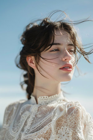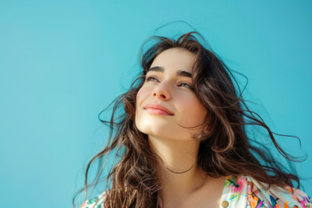 A woman looking up, her hair blowing in the wind against a blue sky, portraying freedom, thoughtfulness, or aspiration