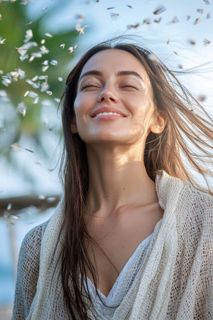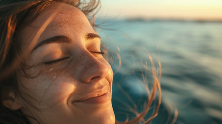 A woman stands at the beach with her eyes closed smiling gently as the wind plays with her hair. The background features a serene seascape at sunset creating a peaceful atmosphere.