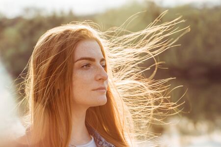 Long hair of the brown-haired young girl scatter in the wind in the sunshine rays of the evening