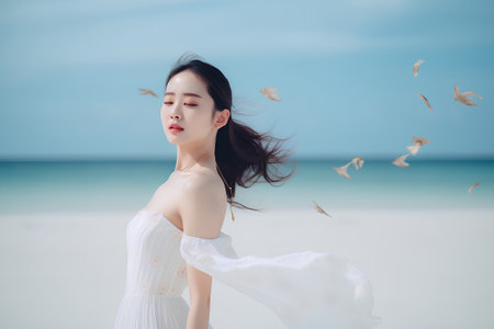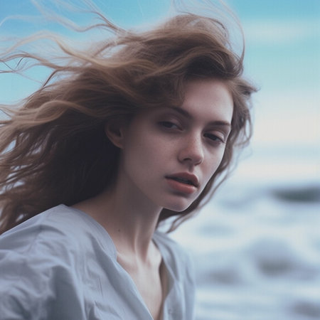 A serene young woman stands by the ocean, eyes closed and enjoying a moment of peace. Windblown hair adds to her tranquil expression, creating a harmonious scene.