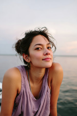 A young Asian woman with short hair looks thoughtfully towards the horizon during a serene sunset, capturing a moment of reflection and peace.