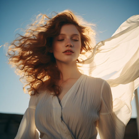 Beautiful young woman enjoys nature freedom with elegance and sensuality generated by artificial intelligence
