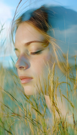 Beautiful Woman with Eyes Closed in a Field, Nature and Beauty Portrait, Double Exposure Effect