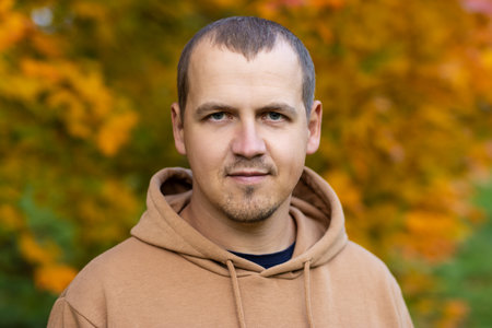 Close-up portrait of young happy man in autumn park