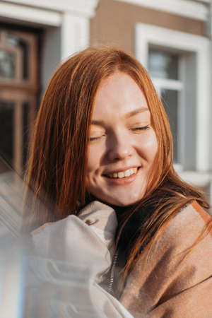 Winter outdoor portrait of a red-haired woman in natural tones. Young woman enjoying life on street Christmas Fair
