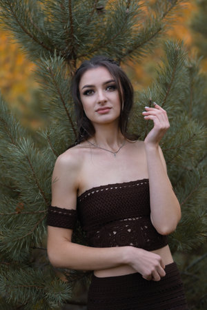 Young elegant woman in the woods near the pine tree posing looking at the camera