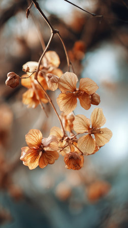 Dry golden hydrangea or hortensia flowers in sunlight, evening light