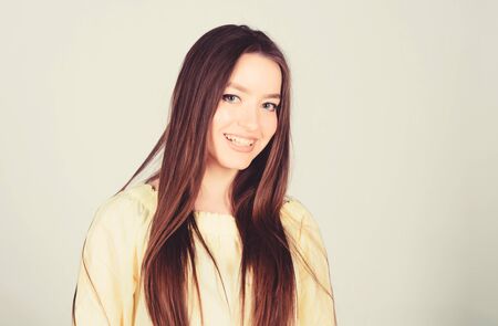 Pretty smiling joyfully female with lond dark hair, dressed casually, looking with satisfaction at camera, being happy isolated against grey studio wall.