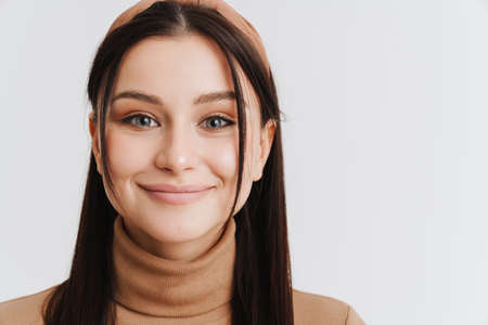 Happy young brunette white woman in casual clothes standing over white background, looking at camera, close up